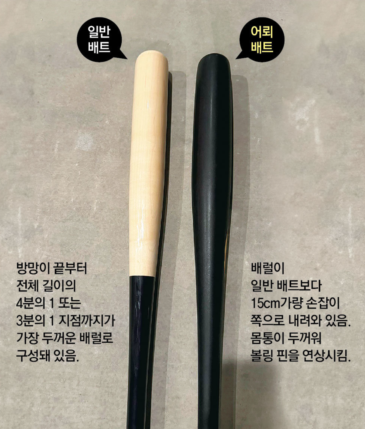 - 배트 형태는 볼링핀처럼 손잡이 쪽이 더 두껍습니다.